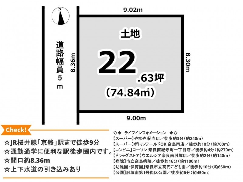 《 建築条件付き土地 》☆近鉄奈良線「富雄」駅 徒歩19分☆前面道路幅員約5.9m☆土地面積約50.34坪