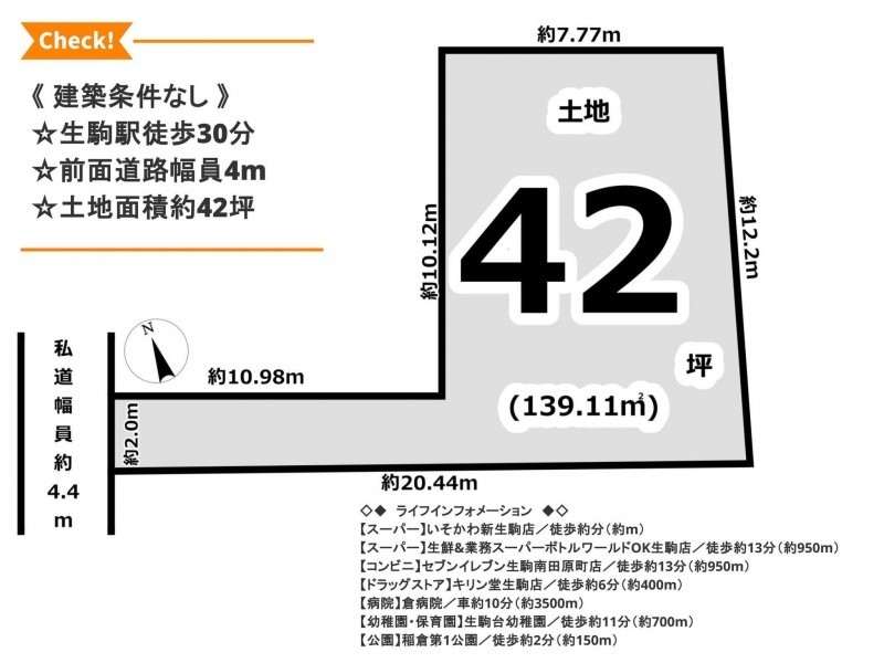 《 建築条件なし 》☆生駒駅徒歩30分☆前面道路幅員4m☆土地面積約42坪