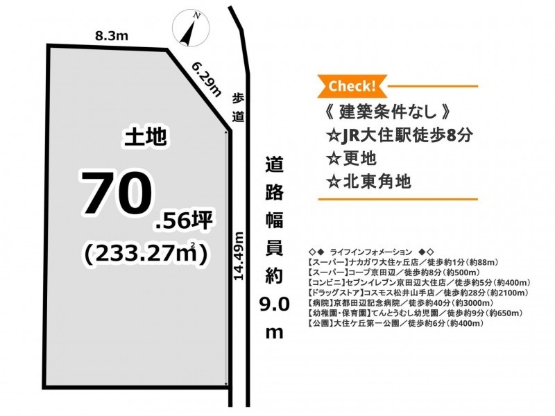 《 建築条件なし 》☆JR大住駅徒歩8分☆更地☆北東角地