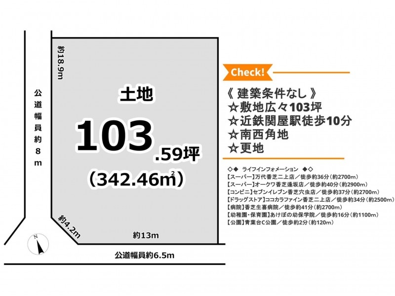 《 建築条件なし 》☆敷地広々103坪☆近鉄関屋駅徒歩10分☆南西角地☆更地