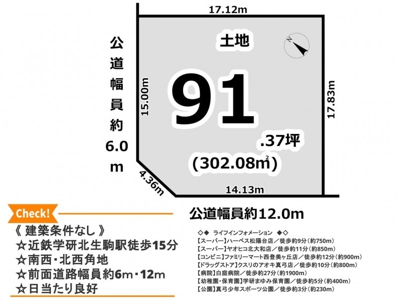 《 建築条件なし 》☆近鉄学研北生駒駅徒歩15分☆南西・北西角地☆前面道路幅員約6m・12m☆日当たり良好
