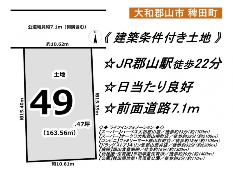 《 建築条件付き土地 》☆JR郡山駅徒歩22分☆日当たり良好☆前面道路7.1m